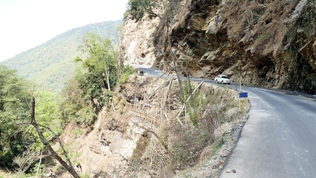 ... straßentechnisch ein e schwierige Strecke. Aber fachmännisch wird mit Bambusgerüsten abgestützt.