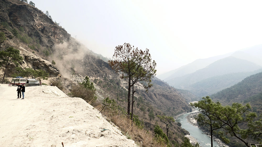 Wir warten an der gesperrten Stelle während hinten mächtig Staub aufgewirbelt wird.