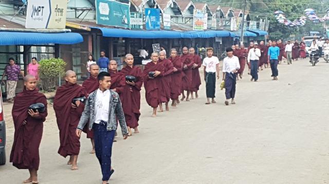 Mönchsparade am Morgen wie in jedem birmanischen Städtchen. Die Mönche sammeln Reis für ihre Mahlzeiten. Sie speisen nur am Morgen und am Mittag.