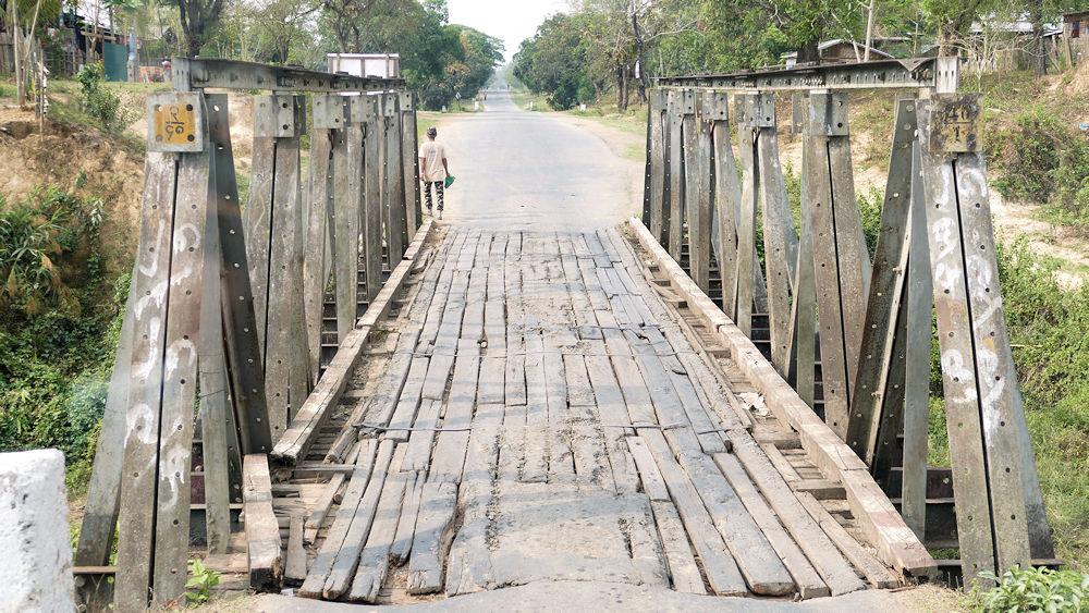 Dutzende solcher Brücken waren heute zu bewältigen. Hier ist nur die Sorge, ob keine spitzen Metallteile herausragen. Zum Glück gab es dadurch nur eine Reifenpanne heute.