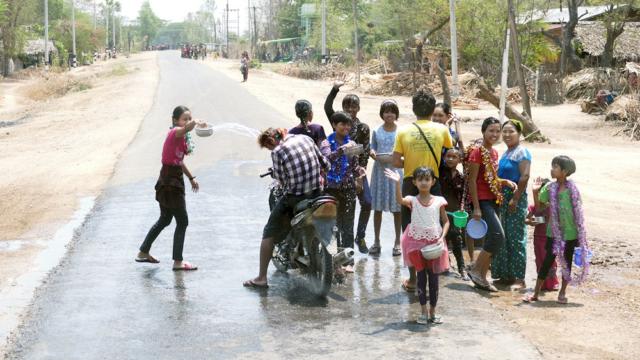 In den Bergen gibt es nicht so viel Wasser. Deshalb fallen die Wasserschlachten bescheiden aus. Brav hält der Mofafahrer hin, dass auch kein Tropfen daneben geht.