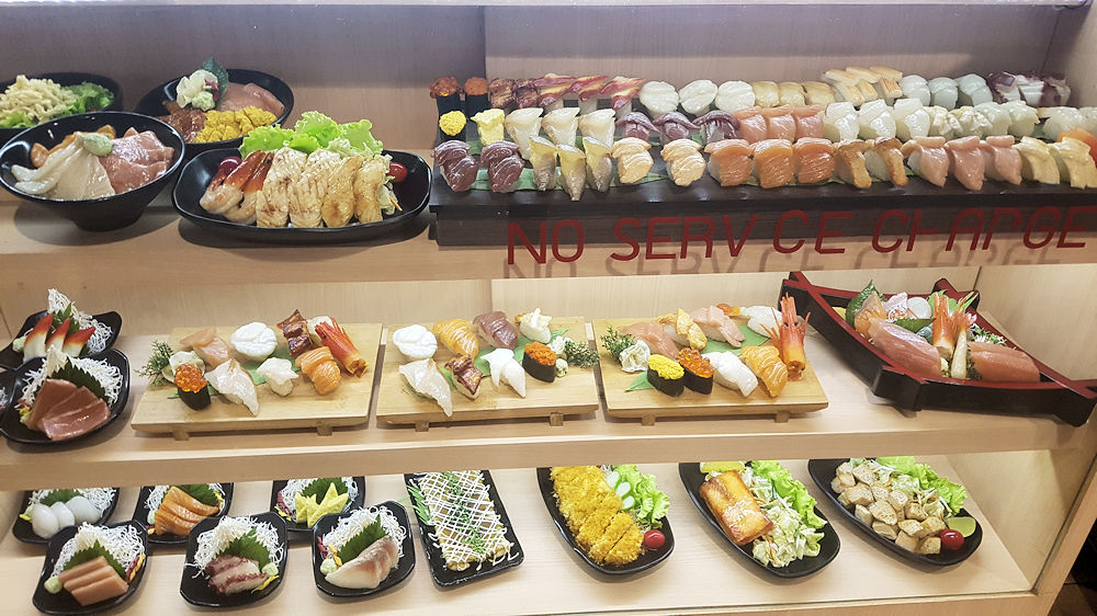Ebenso Food Courts mit Plastikessen in den Auslagen.
