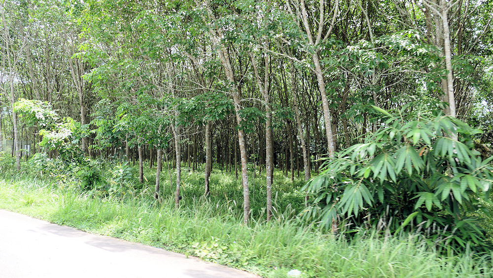 und Kautschukplantagen. Man kann, wenn man genau hinschaut, die kleinen schwarzen Becherchen am Fuß der Bäume erkennen.