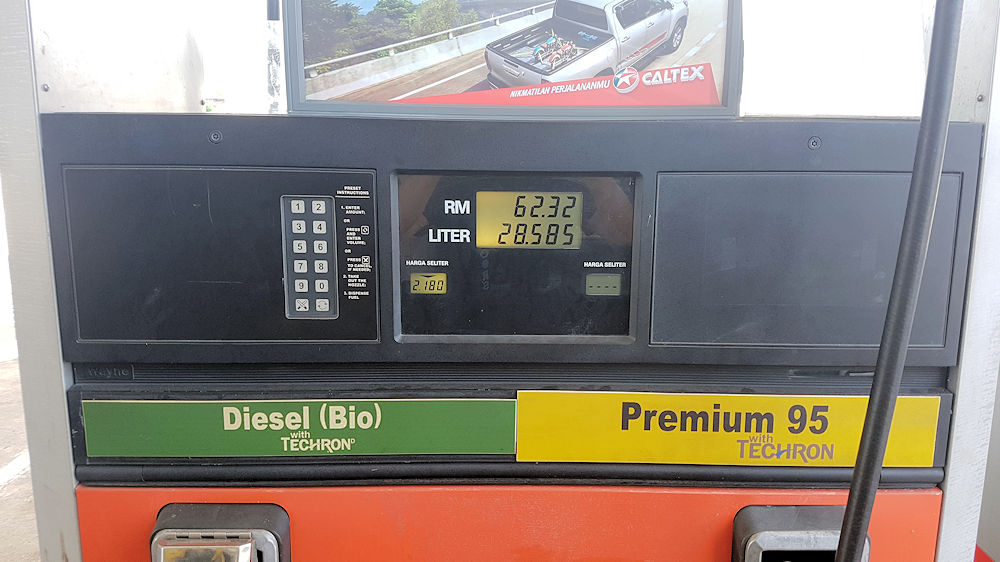 Der Diesel kostet 2,18 Ringitt, das sind 0,46 €. Das ist gut für uns.