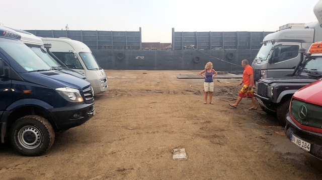 Im Hafen von Port Klang. Im Hintergrund die Plattform, auf der unsere Fahrzeuge stehen sollen. Zur Auffahrt ist Ebbe erforderlich.