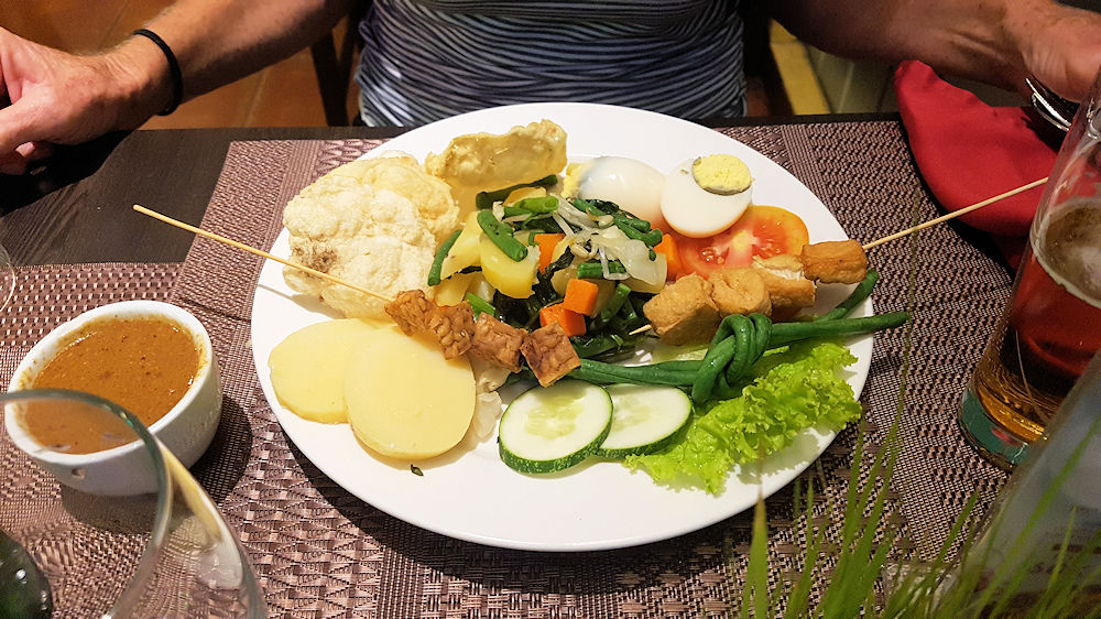 Gado-Gado ist eines der indonesischen Nationalgerichte. Ein Salat mit Tofu, eigentlich sehr lecker. Aber trotz mehrfachem Hinweis auf "no meat, no chicken" haben sie einen der Spieße wieder mit Chicken gemacht.