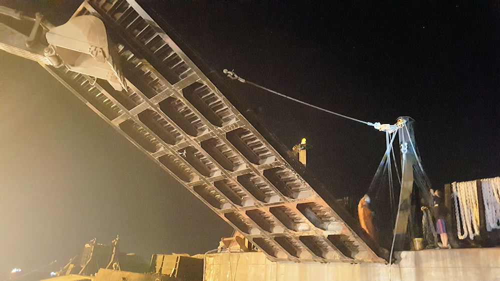 Beim Ablassen der Verladerampe gibt es Probleme und der Bagger muss helfen.