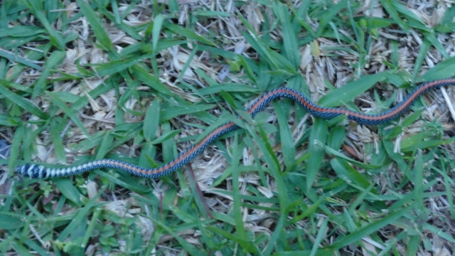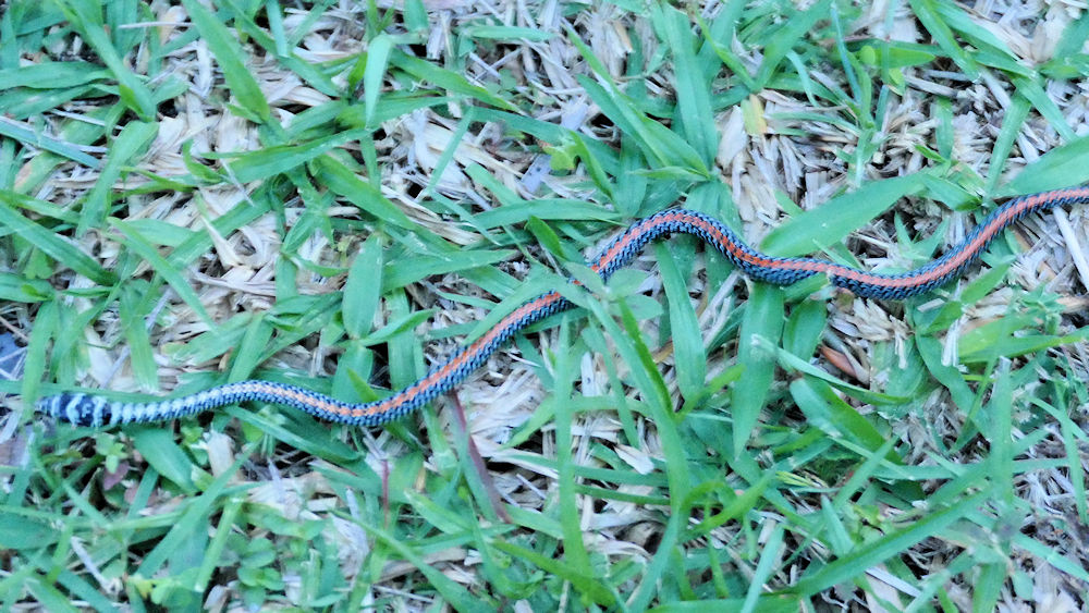 ... besucht uns alsbald diese kleine Schlange. Es ist eine Schmuckbaumnatter, die sogar zu Gleitflügen vom Baum fähig ist. Deshalb war sie auch zuerst auf unserer Eingangsstufe. Giftig?. Ja, aber nicht tödlich.