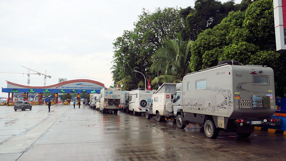 Anstehen vor der Fähre in Bakauheni/Sumatra