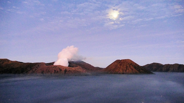 Nur der helle Vollmond leuchtet als wir um 5 Uhr am Kraterrand des Bromo-Vulkan stehen. Im Krater befindet sich ein weiterer aktiver Krater (mit der Dampfwolke).