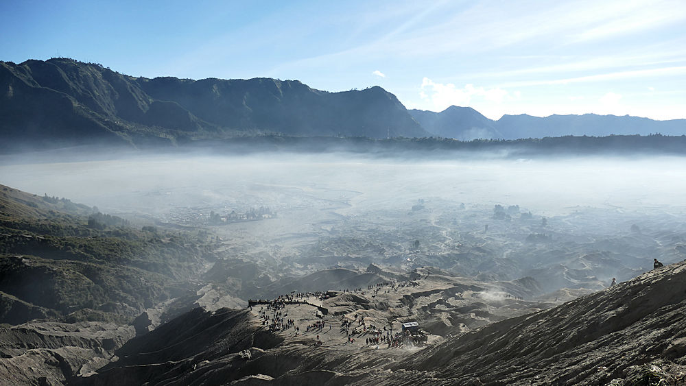 Blick zurück in die Caldera, wo ein Volksfest abgehalten wird.