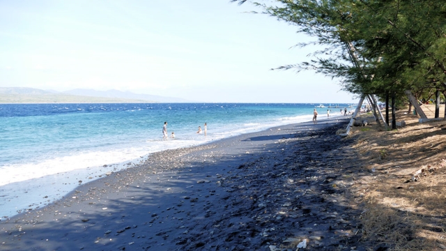 am Strand. Links ist Bali zu sehen.