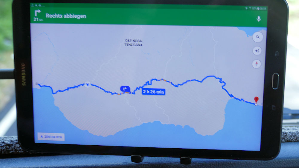 Interressant: Das war nach dem wir die fast die Hälfte der heutigen Strecke gefahren waren. Unsere Position auf der Karte in der Mitte der linken Bildhälfte scheint zu zeigen, dass wir erst so ein Fünftel absolviert haben. Das ist dehalb, weil die erste Häfte der Strecke zwar sehr kurvig war, aber luftlinienmäßig uns nicht vorangebracht hat. |