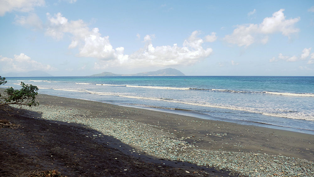 am Strand der blauen Steine. Es liegen jede Menge türkisfarbene Kiesel herum.