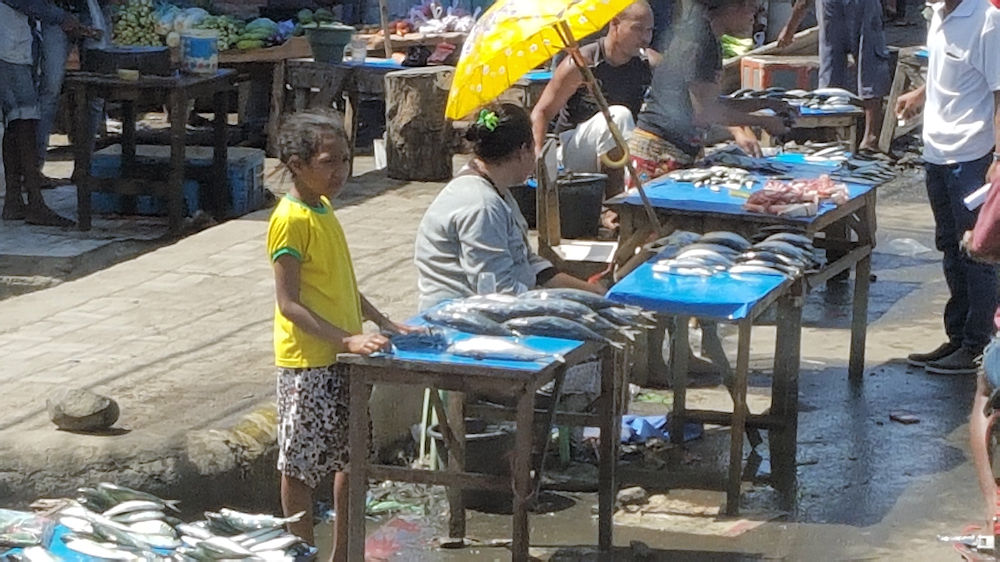 In Maumere kommen wir wieder ans Meer, wie man am üppigen Fischangebot sieht.