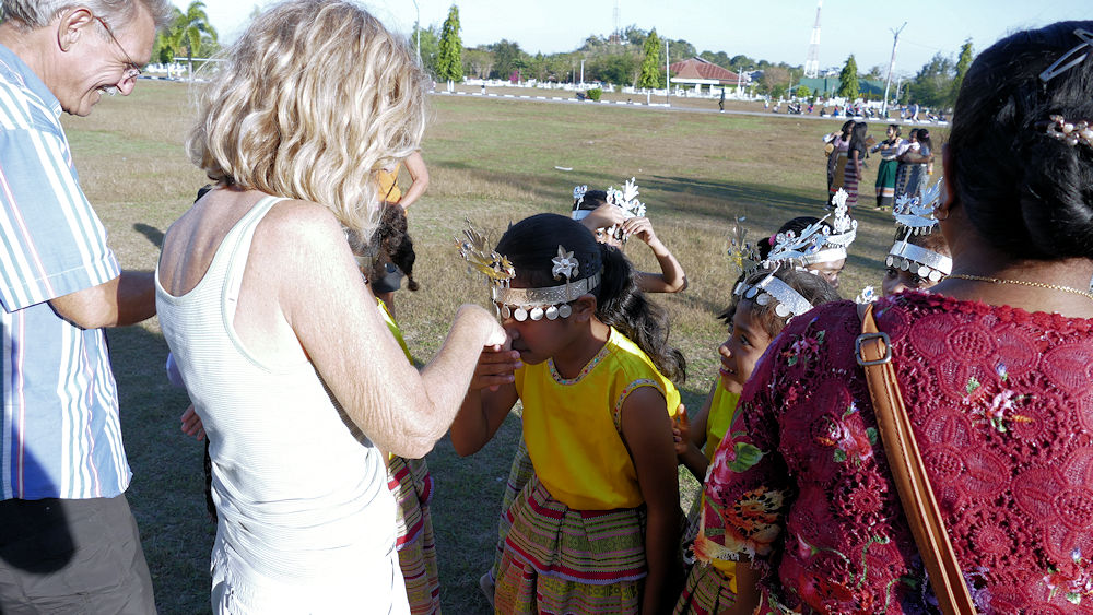 Den handrücken des zu Begrüßenden an die Stirn führen, so wirds in Timor gemacht.
