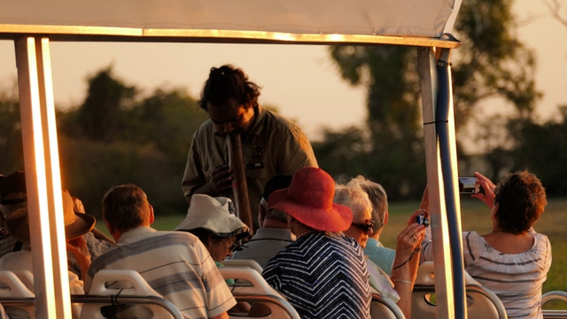 Der Aborigine-Bootsfüher am anderen Boot spielte stimmungsvoll zum Sonnenuntergang auf dem Digeridoo.