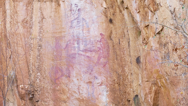 Zu Fuß überwinden wir das Hinderniss (500m), vorbei an Felszeichnungen der Aborigines.