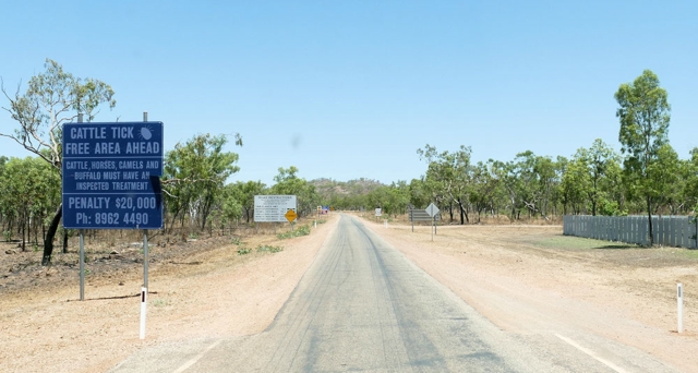 Hier, am Beginn des Tableland Highways, wird davor gewarnt, keine gegen Rinderzecken behandelte Viecher hier weiterzutransportieren.