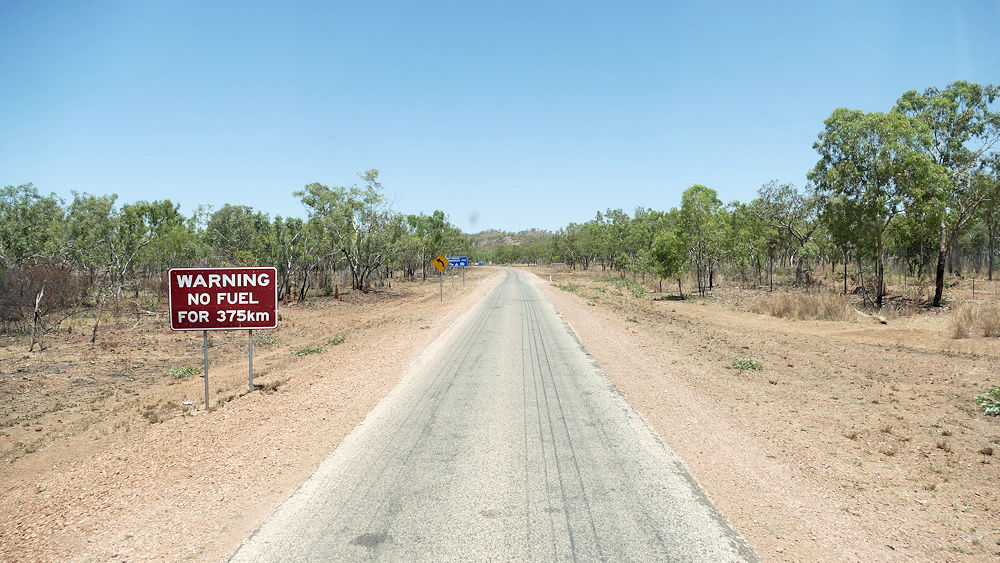 Das nächste Schild weist darauf hin, dass die nächste Tankstelle erst in 375 km kommt.