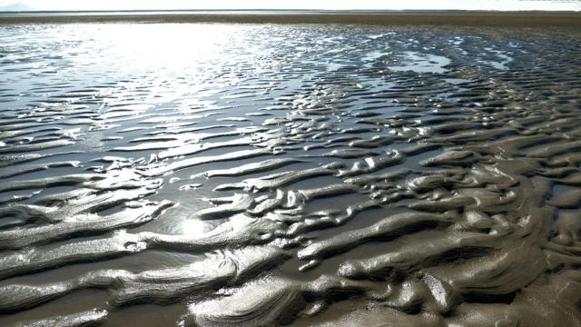 Die Wellen haben erstaunliche graphische Muster in den Sand geformt.