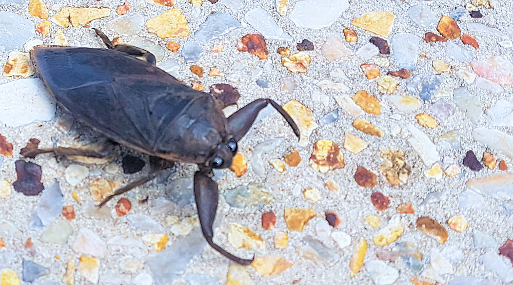 Wenn wir schon bei Tieren sind. Diese Riesenwanze, so 10 cm lang, krabbelte über unseren Parkplatz.