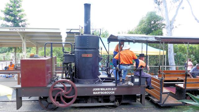 Diese Lokomotive ist ein Nachbau (1998) des Orginals von 1873. Das Schwungrad diente auch als Transmission für eine Säge, die zum Schwellensägen benutzt wurde. Der aufrechtstehende Kessel erlaubte eine Konstruktion mit kurzem Achsstand, um engere Kurvenradien zu haben. |