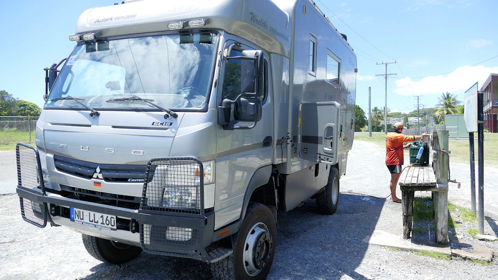 In Rainbow Beach gibt es Trinkwasser zu tanken. Das lassen wir uns nicht zweimal sagen, denn draußen auf der Inskip Peninsula gibt es kein Wasser mehr (außer Salzwasser im Meer natürlich).