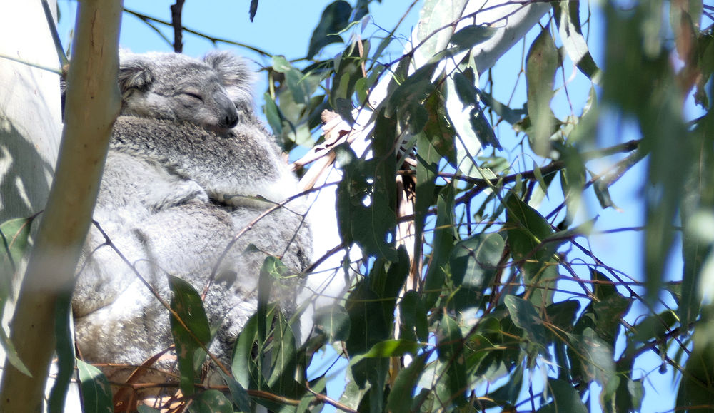Unverhofft, aber hochwillkommen, sind wir im Dalrymple Park auf diese Koalas gestoßen (Mutter mit Jungem).