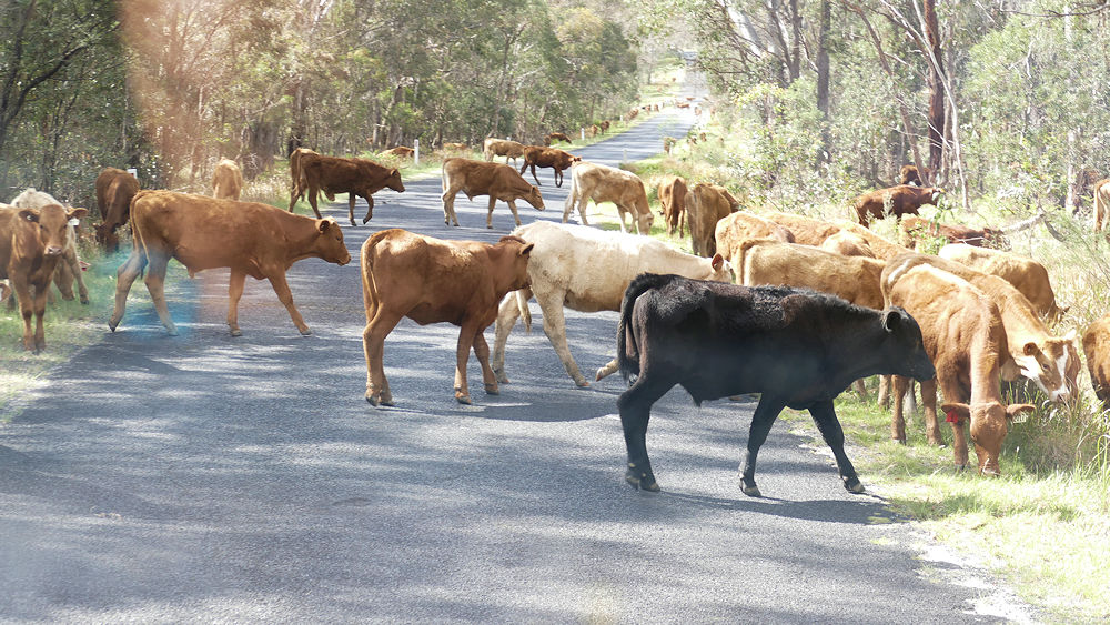 Dann stoppten uns diese Kühe auf einer Nebenstraße zum Gibraltar Range NP.