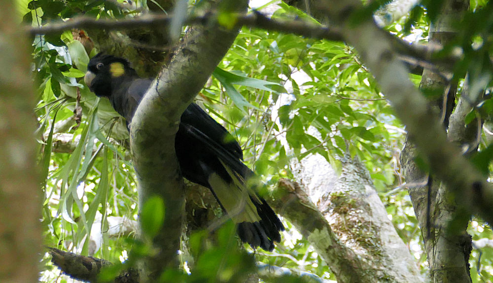 Nur mit viel Glück kann man die Vögel in den Bäumen fotografieren. Hier ein Gelbohr-Rabenkakadu.