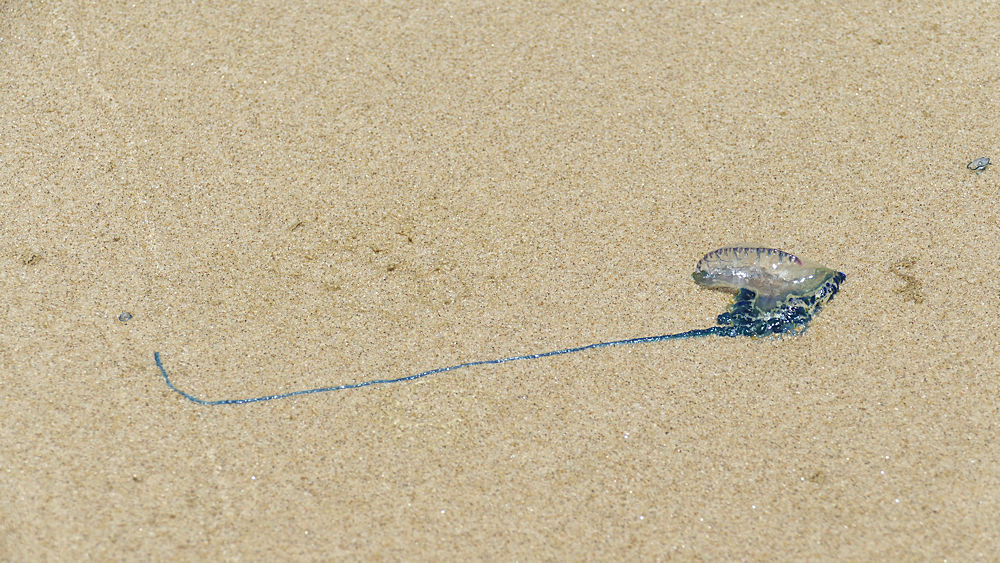 Portugiesische Galeeren sind in großer Zahl an den Strand gespült worden. Im Wasser sind sie beim Baden nicht so angenehm.