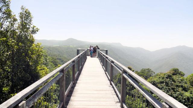 Dorrigo National Park: Am Rainforest Center kann man einen 75 m langen Skywalk betreten um einen tollen Blick auf die Täler des Ostabbruchs der Great Dividing Range zu haben. Leider war die Sicht sehr diesig, wahrscheinlich wegen eines Sandsturms, der gestern sogar Syndney heimgesucht hat. |