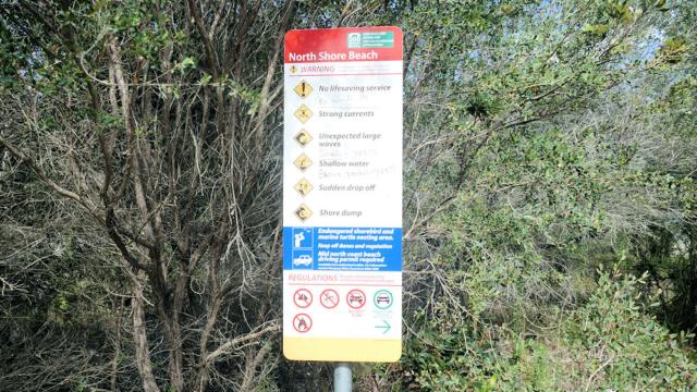 Wenn man den North Shore betritt, wird man gleich gewarnt. Jemand hat dazugeschrieben: "Sharks yes" und "Brown Snakes yes". Braunschlangen sind die giftigsten Schlangen Australiens.