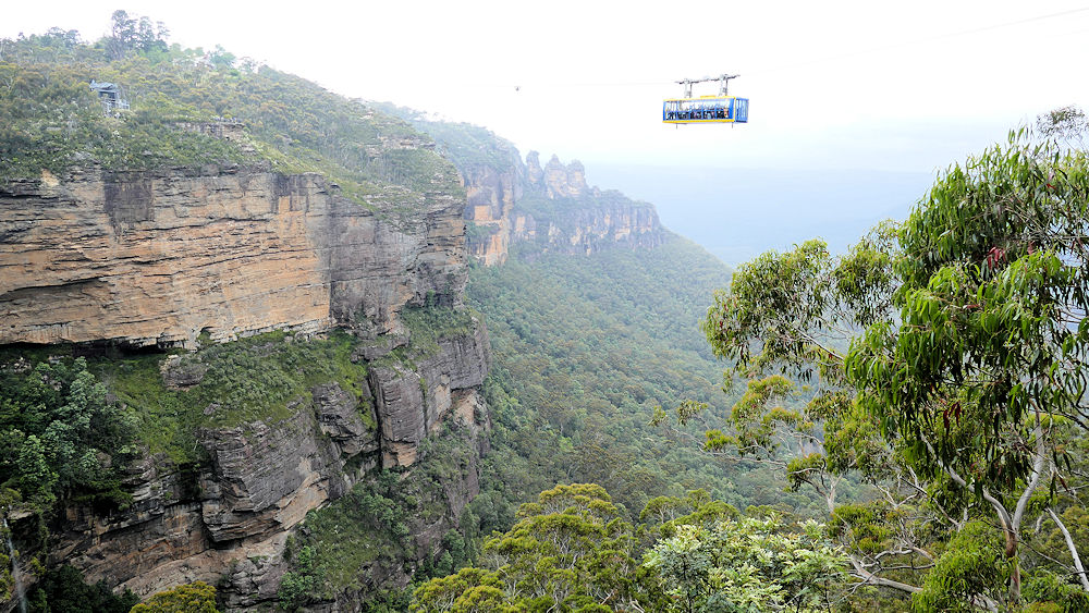 Scenic World Seilbahn "über" den "Three Sisters". Unser Weg führte hinab ins Tal, entlang des Fusses der Felsen bis hinter die "Three Sisters", dann hinauf und entlang des Cliffs wieder zurück.