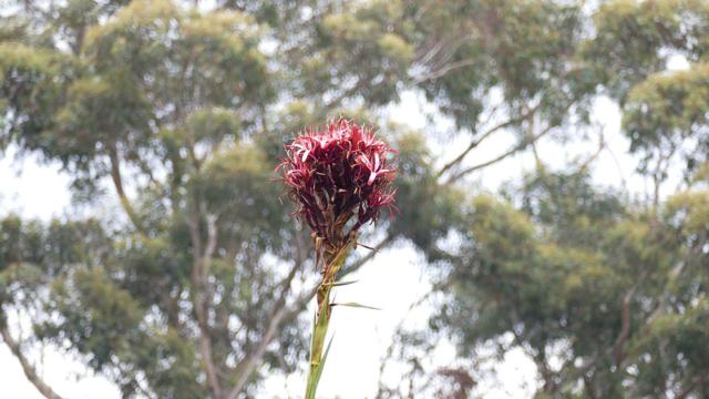 ganz im Gegensatz zur Gymea-Lilie, die nur in den Küstengebieten rund um Sydney zu finden ist. Hier jedoch steht die Pflanze in einem Hausgarten. Die Basis ist agavenähnlich und der bis zu 6 m hohe Blütenstengel trägt diese leuchtendrote Blüte. Die Blüte ist im Frühling und heute, am Sommeranfang müsste die Pflanze verblüht sein. Da wir aber 1.000 m hoch in den Blue Mountains sind, wird sich die Blüte verschoben haben. |