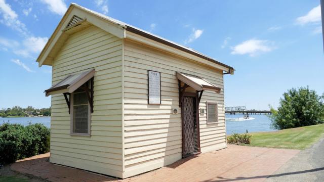 Yarrawwonga. Alte Zollstation neben der Brücke (im Hintergrund) nach New South Wales.