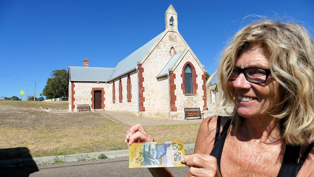 Kurz nach der Abfahrt fuhren wir noch ins Dorf Raukkan, eine Aboriginal Siedlung. David Unaipon (1872-1967), ein dort gebürtiger Aboriginal, war einer der ersten eingeborenen Schriftsteller und ist auf dem derzeitigen 50 Dollarschein abgebildet. Zusammen mit der Kirche in Raukkan (an der rechten Schulter von David). |
