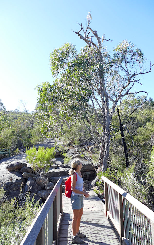 Am Morgen am Start zur unserer Wanderung in die Wonderland Range. Die Kakadus machten einen Höllenspektakel....