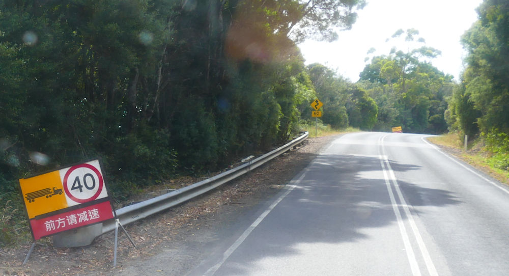 Morgens auf der Great Ocean Road: Wegen der vielen Chinesen sind auch die Verkehrsschilder in deren Sprache.