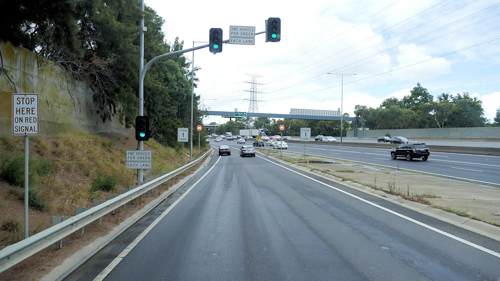 Beim Einfahren auf die Stadtautobahn ist eine Ampel um den einfahrenden Verkehr zu drosseln.