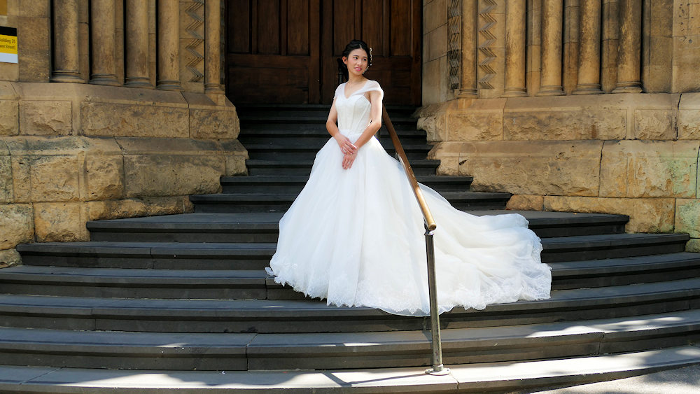 Wir sahen einige chinesische Bräute beim posieren für das Hochzeitsfoto.