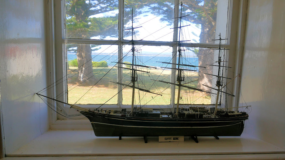 Vor dem Fenster ein Modell der Cutty Sark. Einem berühmten Teesegler des späten 19. Jahrhunderts. Es soll das schnellste Segelschiff seiner Zeit gewesen sein.