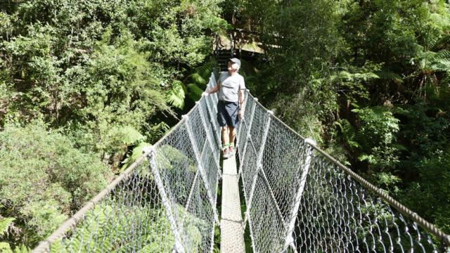 Die Hängebrücke unterhalb der Falls markiert die Stelle, wo früher eine Brücke für die Bahn bestand (siehe schwarz-weiß-Foto).