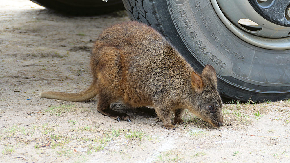 Das Tasmanisches Pademelon (Kleine Känguruart) hat keine Scheu vor unserem LKWle.