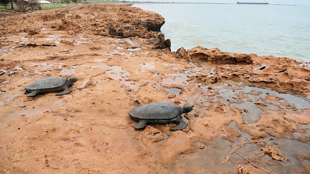 Trotz der Nähe des Industriehafen, gibt es hier Meeresschildkröten. Nein, nicht diese aus Bronze sind gemeint.
