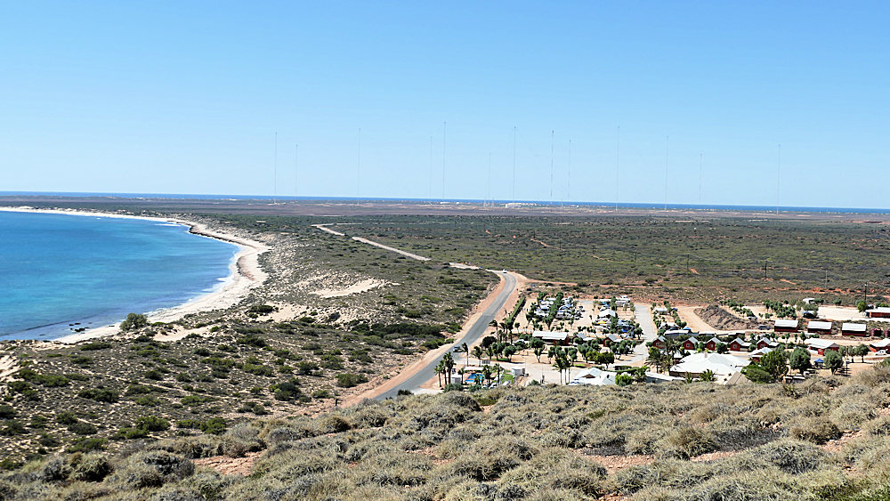 Der Blick nach Osten vom Leuchtturm: Der Campingplatz am Leuchtturm und in der Ferne, kaum im Blau des Himmels zu erkennen, die Langwellenanlage der Amerikaner. Sie dient zur Kommunikation mit den U-Booten.
