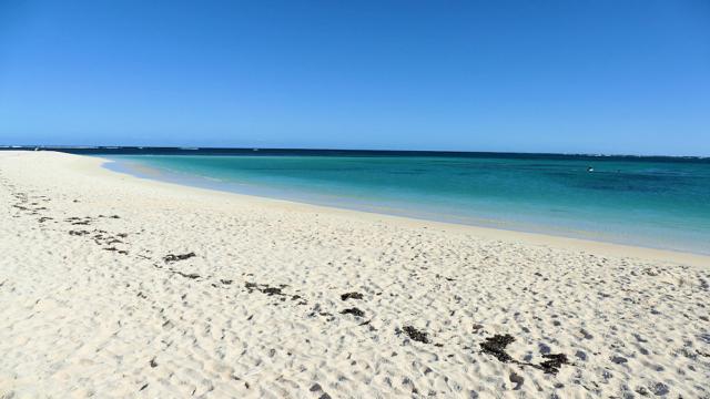 Turquoise Bay. Das Reef liegt dicht vor der Küste. Draußen sieht man die Wellen anbranden.