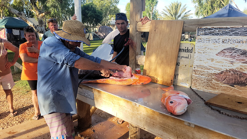Das Größte für die Australier ist fischen und so werden allabendlich am Campground die Fänge begutachtet und dann zerlegt. Red Snapper und...