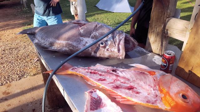 auch Tiefseefische (diesen großen grauen Fisch hat der Angler aus 250 m Tiefe geholt, hat er gesagt).